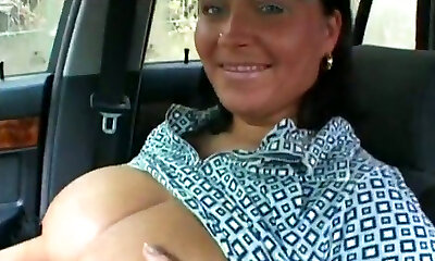 Huge funbags brunette babe gets her pussy banged in her crimson car