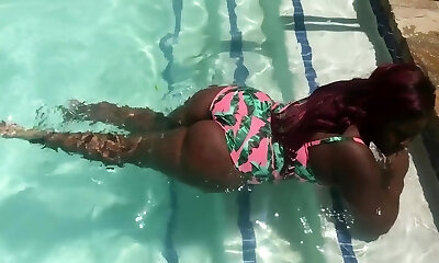 Thicc ebony queen mounts ebony dude's huge weenie by the pool