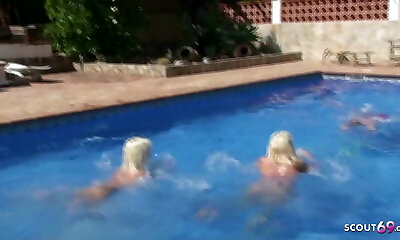 Two total beauties are impressed with his pool and give up the vulva